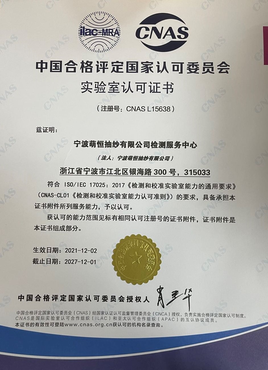近日,寧波萌恒抽紗有限公司檢測服務(wù)中心正式獲得中國合格評定國家認(rèn)可委員會(huì)(CNAS)資質(zhì)認(rèn)可。