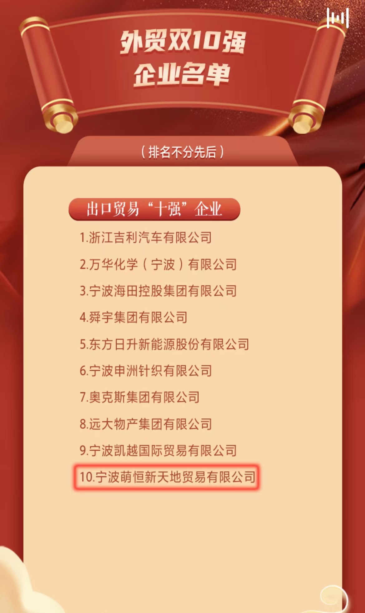 7月14日上午,被譽為“寧波經濟奧斯卡”的2022寧波創新創業風云榜再次揭開帷幕。寧波萌恒新天地貿易限公司憑借強大的綜合實力、長足的提升能力和不竭的發展動力榮獲開放提升類外貿雙10強企業中的出口貿易“十強”企業 這已是本榜單發布的第18個年頭,但與往年不同的是,今年風云榜以數字化、新能源化、品牌化、國際化等為導向,以“大優強綠新高”為重點,設置了綜合貢獻類、行業領軍類、創新提質類、轉型升級類、開放提升類五大類別榜單,大力表彰了在納稅貢獻、行業領軍、創新提質、轉型升級、開放提升等方面具有引領性、導向性、標志性的企業和單位。 進入十四五時期,寧波的經濟實力穩步提升,離不開強大的貿易推動。根據寧波海關的數據,2023年1-5月,寧波全市的貿易總額為5141.9億元。其中,寧波的出口貿易額高達3343.3億元。寧波也憑借這一喜人的成績在中國最新的出口貿易十強榜單中位列第五。 在擁有如此優異成績的貿易強市中榮登出口貿易“十強”企業榜單,既是對萌恒過去一年努力的肯定、實力的認可,也是對未來前進的鼓勵、發展的鞭策。萌恒將不忘初心,砥礪前行,不斷提升自身的核心競爭力,積極發揮模范先鋒作用,助力全市經濟高質量發展。
