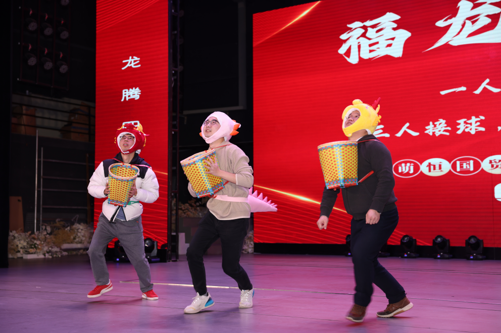 游戲互動環節,大家都踴躍參與。一人勝出,全桌獲獎的游戲規則,將大家的凝聚力和團結心體現得淋漓盡致。猜歌名,唱歌曲,你不會,我來唱!大家一起齊心協力,集思廣益。在福龍戲珠環節,三個可愛龍龍的T臺秀引來陣陣歡笑,福龍奮力接取萌兔拋出的珍珠的樣子更是抓住了所有人的眼球。這也寓意著龍年接過兔年的交接棒,相信我們在新的一年會更加充滿激情和活力,奮勇爭先,拔得頭籌!