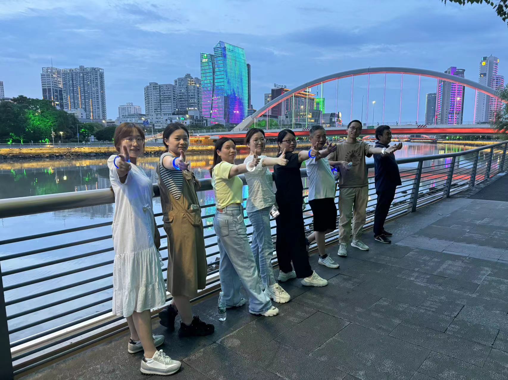 6月21日晚,國貿健步協會59名成員在公司一樓大廳齊聚一堂,整裝待發,開啟健步協會2.0版升級后的第一次戶外徒步活動。沿著奉化江畔,帶上發光手環,一群人浩浩蕩蕩,共同探索城市之美。 此次徒步路線長約5.6km,共設有澄浪橋和琴橋2個打卡點。所有成員被分為六組,每組小伙伴需到特定的打卡點擺出規定的拍照姿勢并合照,才算任務完成。小伙伴們熱情高漲,紛紛和組員一道擺出絕美造型,配上發光手環,成為江邊一抹亮麗的風景線。讓我們來聽聽成員們對當天活動的感想吧! 業務二部 李玲碧:在三江美景下,坐了一天的我們健步如飛。在打卡點留下我們的身影,琴橋上拍下舟宿夜江的美景,汗漸漸走了出來,但是人卻越走越輕松,運動果然是解壓最好的方式。 流程與IT部 梁雪峰:從落日余暉到夜幕降臨,天色一點點暗去,不變的是那一份夏日的愜意。結束一周的工作,我們三五成群,各自談笑,漫步在夜色的江岸,享受著迎面吹來的陣陣涼風,看看江邊形形色色的人群,再看看那迷人的霓虹燈光,不得不說,這也是一種別樣的體驗。 總經辦 施碧芳:健步是一種輕松愉悅的運動方式,能很好地緩解一天的疲勞,強身健體。長時間坐在辦公室里工作,讓我們的身體慢慢變得虛弱,公司組織的健步夜走活動,讓我們有機會在工作之余,放松自己,鍛煉自己。大家沿著奉化江畔,一路上有說有笑,氣氛輕松愉快,在夜幕降臨時,共同欣賞城市換上花燈璀璨的新裝,一股幸福感溢滿心頭。 此次活動不僅讓成員們體驗到了行走的樂趣,更讓他們在互動中感受到了團隊的力量和溫暖。健步協會旨在向廣大員工倡導科學健身的理念,推崇科學實用的健身方式,積極引導大家養成良好的運動和生活習慣。希望大家放松心情,緩解壓力,收獲健康,增進友誼。我們誠摯地歡迎更多的小伙伴加入健步的行列,和我們一起快樂地走起來!