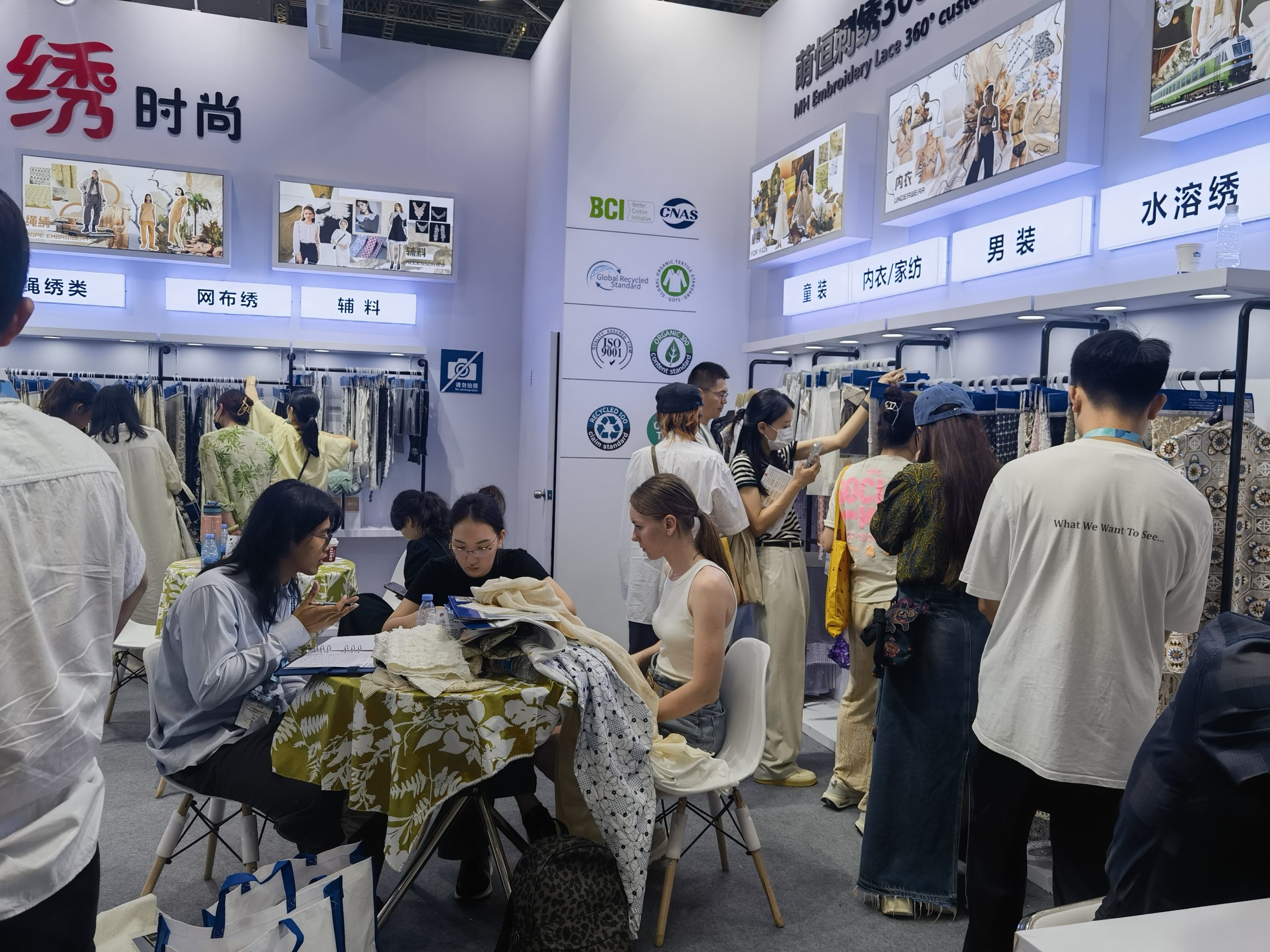8月27日,為期三天的2024中國國際紡織面料及輔料(秋冬)博覽會在上海開幕,萌恒花邊事業部前往參展。在此次展會上,我們展出融合傳統與現代元素的股繩繡、水溶繡、網布繡等多樣化產品種類,還展示了男士時裝、內衣、童裝等特色刺繡作品。