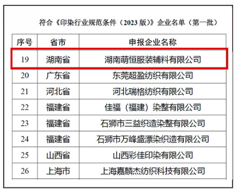 為推動印染行業(yè)結(jié)構(gòu)調(diào)整和轉(zhuǎn)型升級,引導行業(yè)高端化智能化綠色化發(fā)展,根據(jù)《印染行業(yè)規(guī)范公告管理辦法》有關規(guī)定,工信部今年組織開展了印染企業(yè)規(guī)范公告申報和復核工作。經(jīng)企業(yè)自主申報、省級工業(yè)和信息化主管部門核實推薦、專家組評審、征求生態(tài)環(huán)境部意見等程序,9月12日,公示通過了第一批符合《印染行業(yè)規(guī)范條件(2023版)》企業(yè)名單。其中,湖南有三家企業(yè)入圍,萌恒榜上有名!