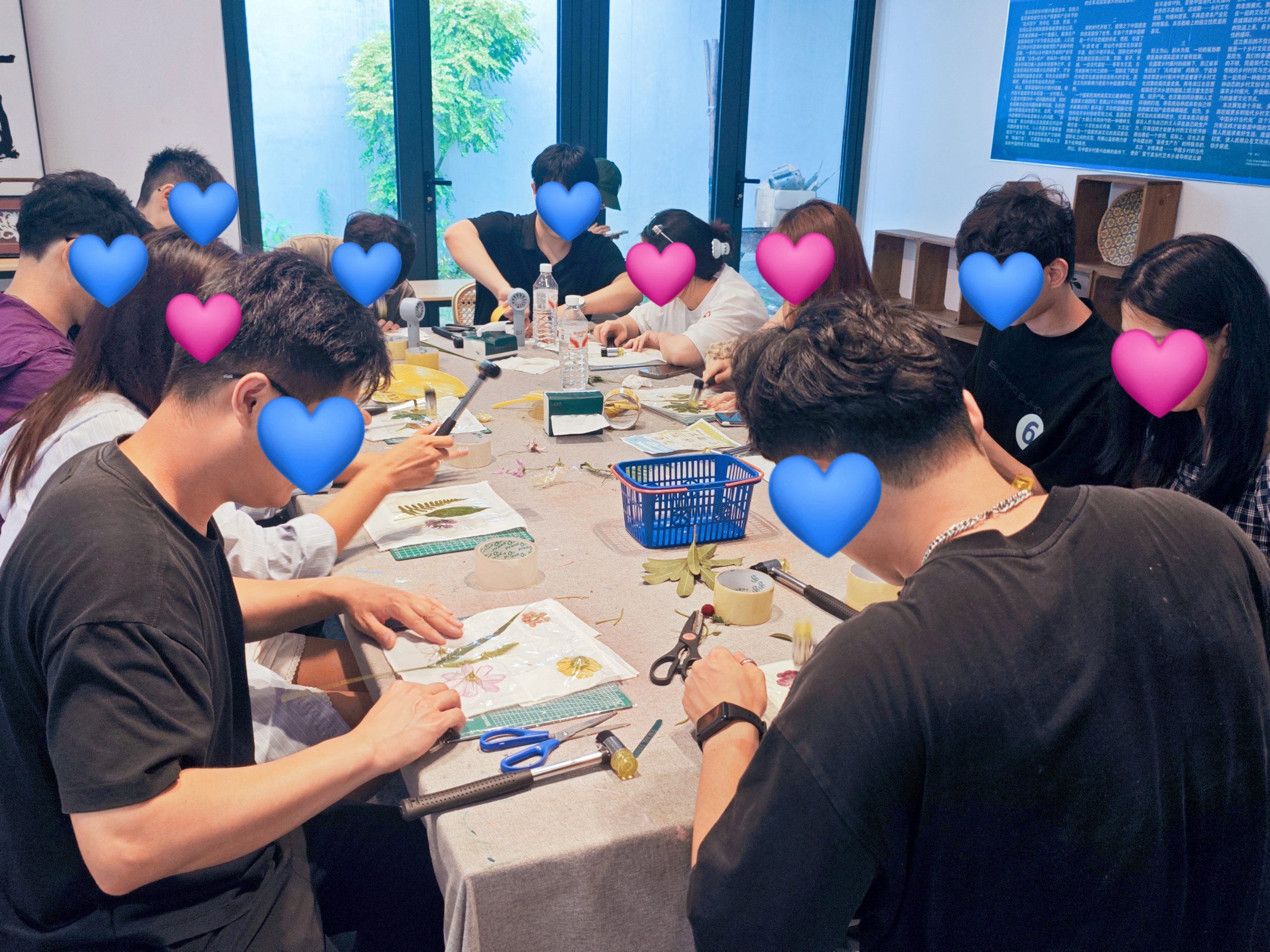 在專業老師指導下,一場充滿自然氣息的“植物拓染”體驗展開。花瓣與葉片的天然汁液被輕輕敲打、拓印在素凈的棉布上,留下獨一無二的紋理與色彩,將山野的饋贈與此刻的美好時光一同封存。