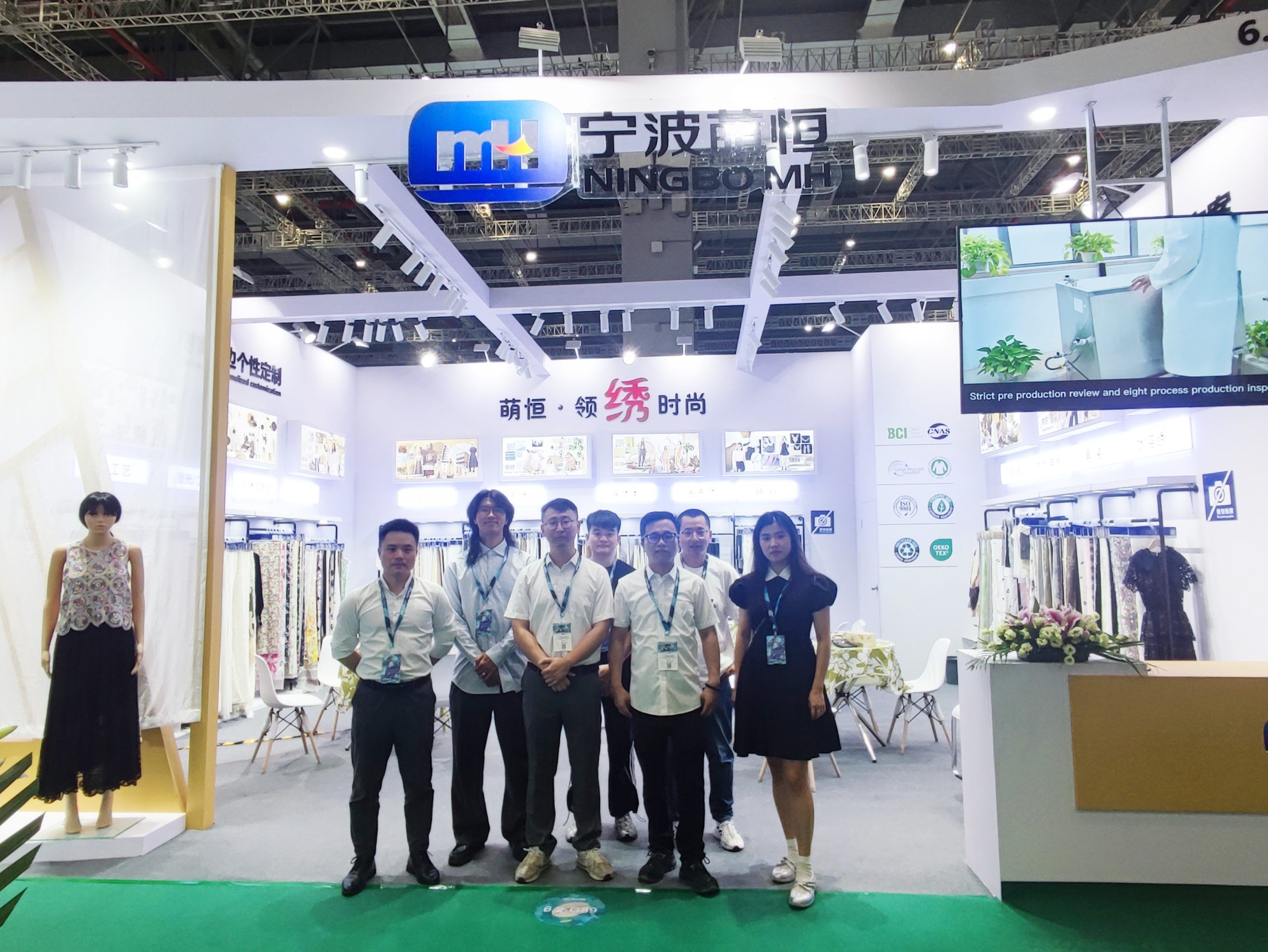 展會現場,公司展位吸引眾多國內外客商駐足,工作人員以扎實的專業知識和豐富經驗,為參展客商進行詳細而耐心的講解,彰顯了公司團隊專業素養與服務水平,為客戶留下深刻印象,增強了客戶對我們品牌的信任與認可。參展期間,瑞士OEKO-TEX公司相關負責人還蒞臨現場,為萌恒親自授牌,進一步認證了我們產品的綠色、環保、健康、安全。