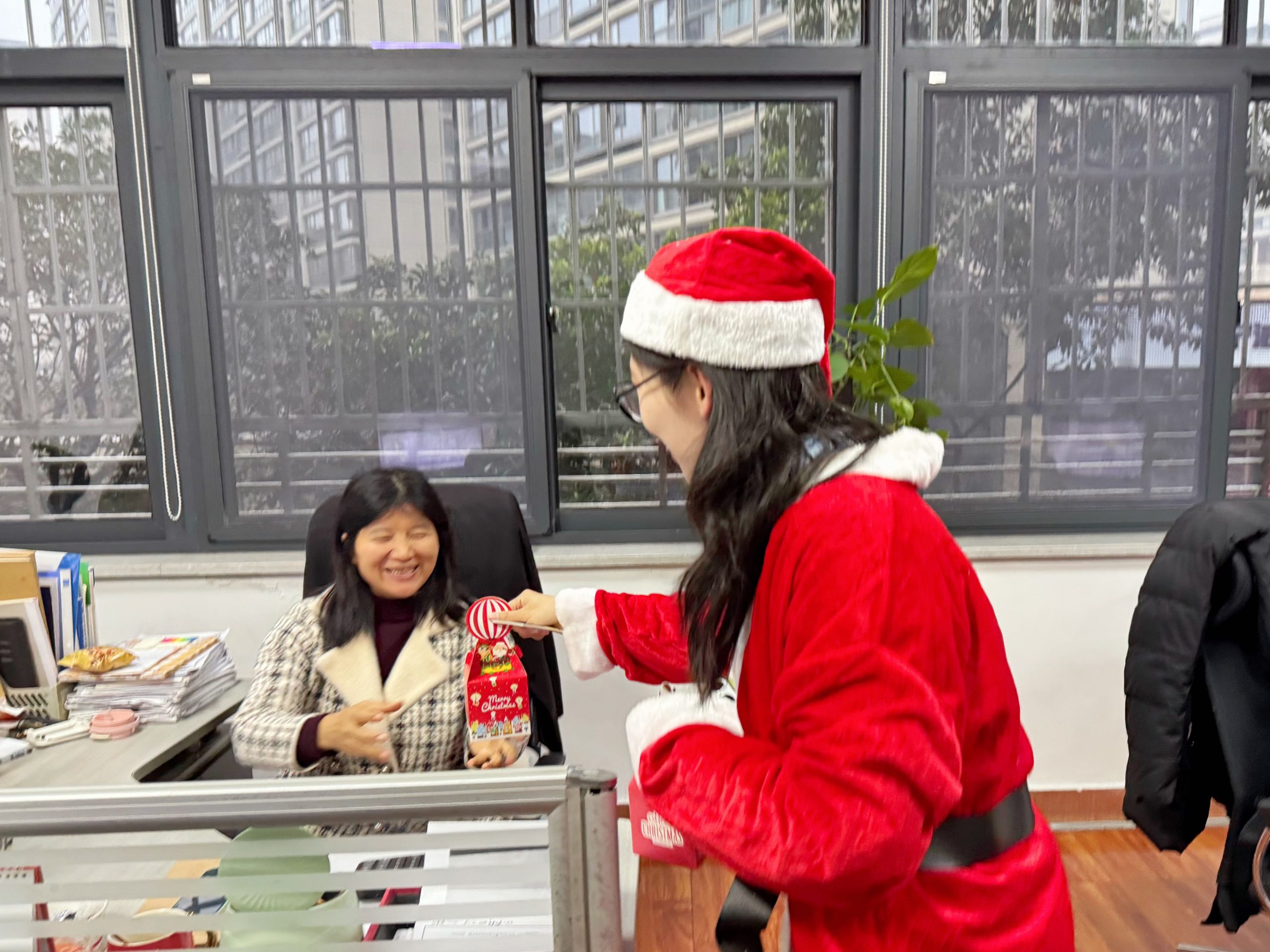 12月24日下午,在制造事業(yè)部寧波基地有兩位身著紅衣、笑容可掬的圣誕老人穿梭在大家的工位間,為每一位伙伴送上了平安果以及精美的圣誕襪禮袋。那一個個色澤鮮艷、圓潤飽滿的平安果,傳遞著公司最真摯的掛念,承載著對大家平平安安、順?biāo)烊缫獾拿篮米8!>碌氖フQ襪禮袋里,隨機(jī)放置著精致的賀卡。哪位幸運的伙伴在自己的禮袋中發(fā)現(xiàn)了賀卡,便意味著成了當(dāng)天的幸運之星。賀卡的背面設(shè)有特別的刮刮區(qū),其中藏著意想不到的驚喜。只需輕輕刮開,就可在圣誕節(jié)當(dāng)天,憑借著這份獨特的幸運,向工作人員兌換專屬禮物,收獲節(jié)日驚喜。希望這份來自公司的圣誕心意,能為大家增添更多的歡樂與溫馨,愿幸運常伴每一位左右!
